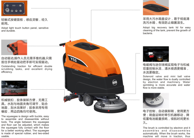 -刷盤:電子控制,自動裝卸刷,使用更方便;刷盤運轉(zhuǎn)時牽引機器移動,降低蓄電池能量損耗,續(xù)航時間更長久。